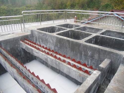 有益效果:采用本適用新型高鹽廢水絮凝沉淀池,在沉淀池主機、進水隔斷等局部設(shè)置耐高鹽廢水腐蝕層,選用UPVC、不銹鋼等資料,對沉淀池主機內(nèi)高鹽廢水起到隔離防護作用,耐腐蝕,能滿足高鹽廢水介質(zhì)的特殊環(huán)境,設(shè)備壽命長。